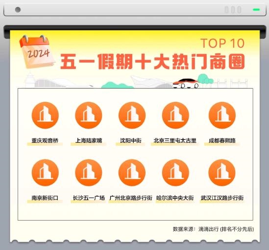 承載了“逛吃玩”需求一體的大型商圈也是五一出行的熱門。假期前往大型商圈的用車需求環(huán)比上漲118%。從打車需求來看,重慶觀音橋、上海陸家嘴、沈陽中街等成為今年五一十大熱門商圈。其中前往重慶觀音橋、長沙五一廣場的用車需求同比上漲均超50%。