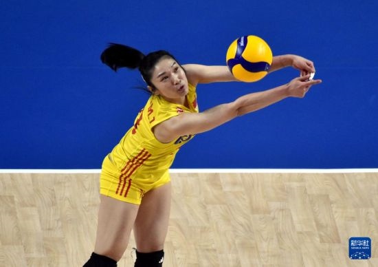 6月15日,中國隊(duì)球員王媛媛在比賽中扣球。新華社記者盧炳輝攝