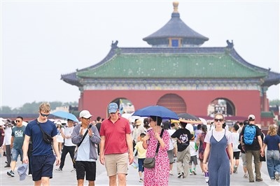 在北京天壇公園,外國游客在導(dǎo)游的帶領(lǐng)下游覽。新華社記者 鞠煥宗攝