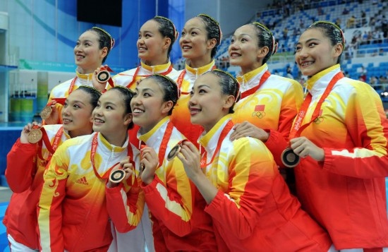 2008年8月23日,中國隊隊員在領(lǐng)獎臺上展示獎牌。當(dāng)日,在國家游泳中心——“水立方”舉行的北京奧運(yùn)會花樣游泳集體自由自選決賽中,中國隊以97.500分的總成績獲得該項目銅牌。新華社記者 王定昶 攝