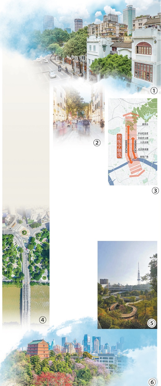 圖①:廣州市越秀區(qū)起義路街景。圖②:廣州市越秀區(qū)北京路步行街。圖③:廣州傳統(tǒng)中軸線示意圖。圖④:廣州市越秀區(qū)海珠廣場(chǎng)鳥瞰圖。黃 劍攝(人民視覺)圖⑤:廣州“云道”越秀山段。圖⑥:廣州市越秀區(qū)越秀山鎮(zhèn)海樓。圖①②③⑤⑥均為廣州市規(guī)劃和自然資源局提供