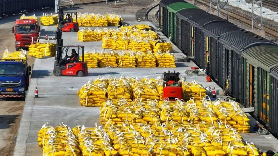 2月11日,石家莊鐵路物流中心辛集營業(yè)部晉州貨場內(nèi),一袋袋化肥從棚車卸下,準(zhǔn)備運往田間地頭。
