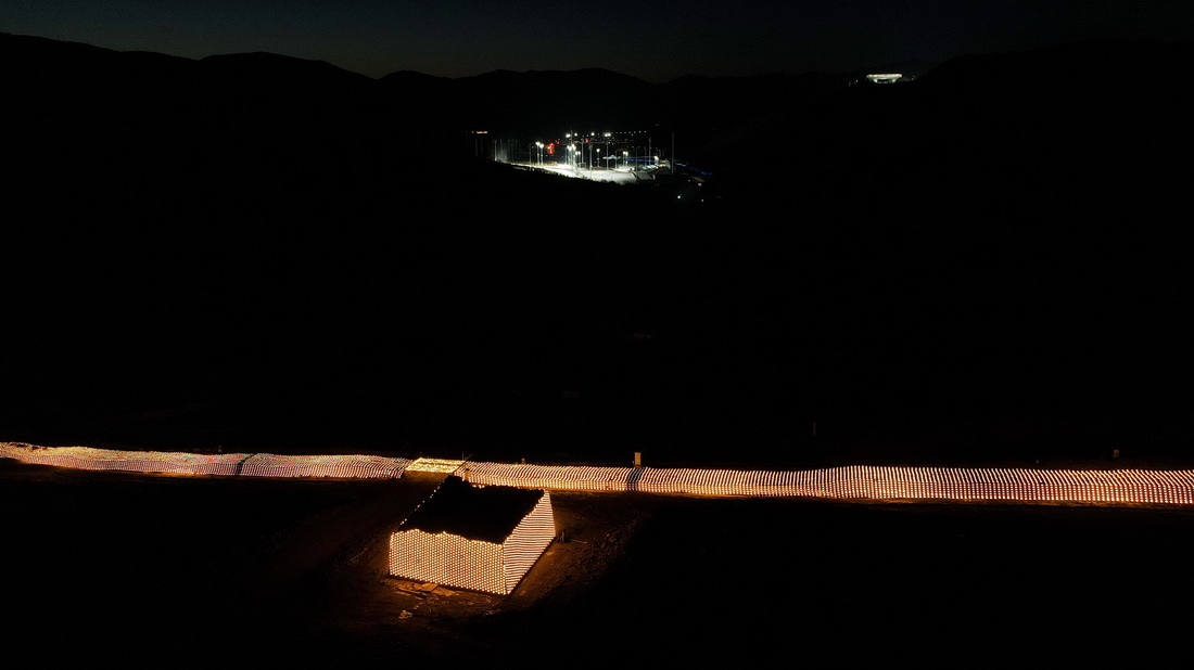 這是12月30日拍攝的崇禮長(zhǎng)城景觀展示亮化工程現(xiàn)場(chǎng),遠(yuǎn)處為國(guó)家越野滑雪中心(無(wú)人機(jī)照片)。新華社記者 牟宇 攝