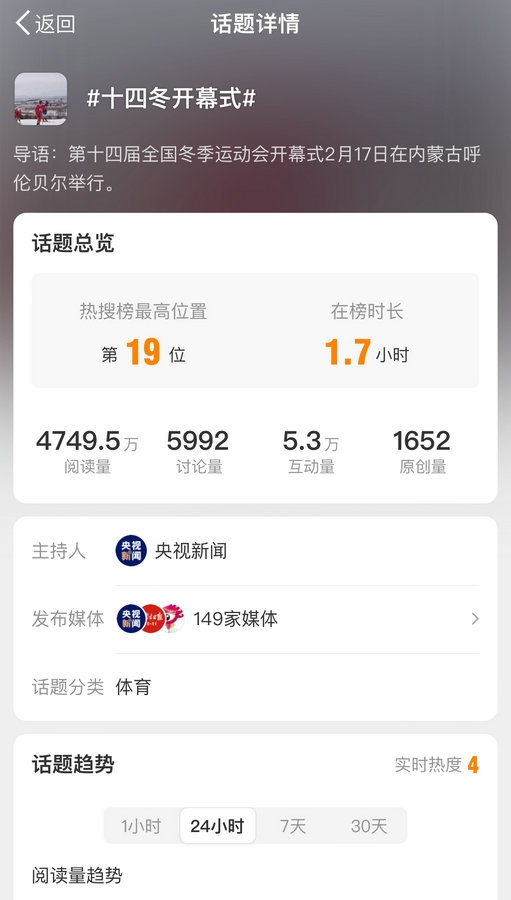 國內(nèi)多家主流媒體對開幕式進行報道,話題#十四冬開幕式# #十四冬點火超燃瞬間#等話題登上微博熱搜榜,閱讀量近8000萬。