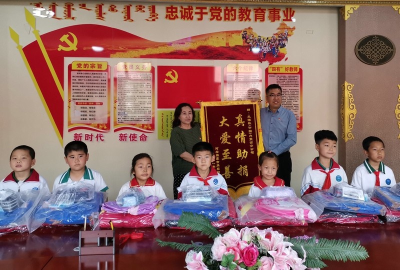 活動當天,人們來到阿拉善左旗蒙古族實驗小學,為烏日力格等10位貧困蒙古族學生送去學生用品及衣物,雙方支部還為學校捐贈無限極植雅洗手液兩箱。
