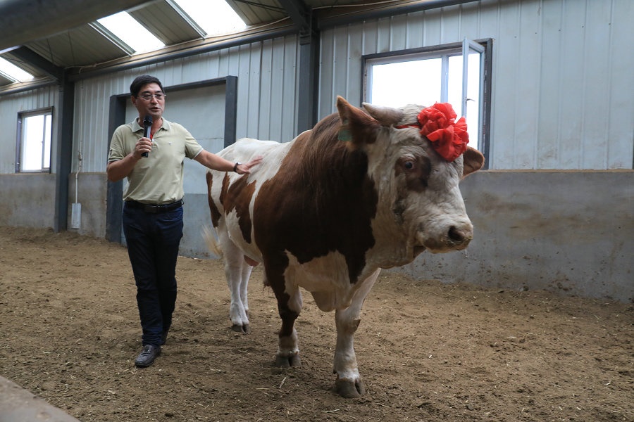 在內(nèi)蒙古巴林左旗內(nèi)蒙古廣匯牧業(yè)肉牛綜合示范園區(qū),頭戴大紅花的肉牛格外醒目,原來這是獲得該旗肉牛大賽二等獎的獲獎牛,重2200斤,價值33000元。